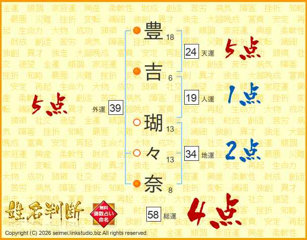 豊(18画)吉(6画) 瑚(13画)々(13画)奈(8画)