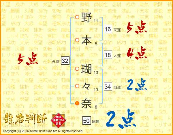 野(11画)本(5画) 瑚(13画)々(13画)奈(8画)
