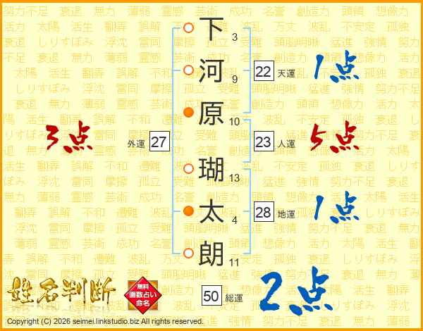 下(3画)河(9画)原(10画) 瑚(13画)太(4画)朗(11画)