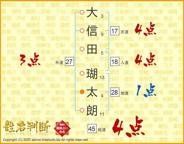 大(3画)信(9画)田(5画) 瑚(13画)太(4画)朗(11画)
