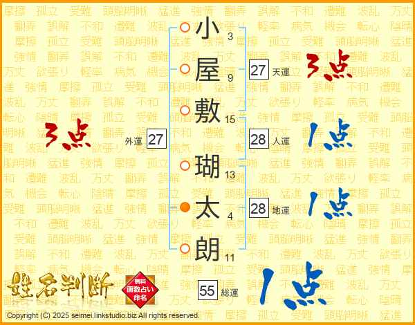 小(3画)屋(9画)敷(15画) 瑚(13画)太(4画)朗(11画)
