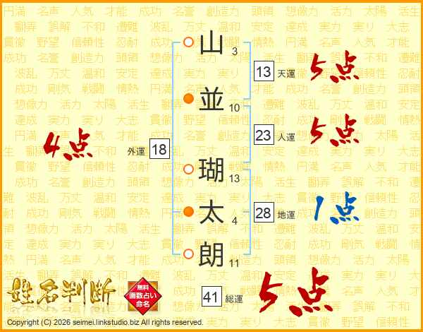 山(3画)並(10画) 瑚(13画)太(4画)朗(11画)