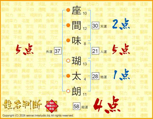 座間味瑚太朗さんの総運は58画の4点!