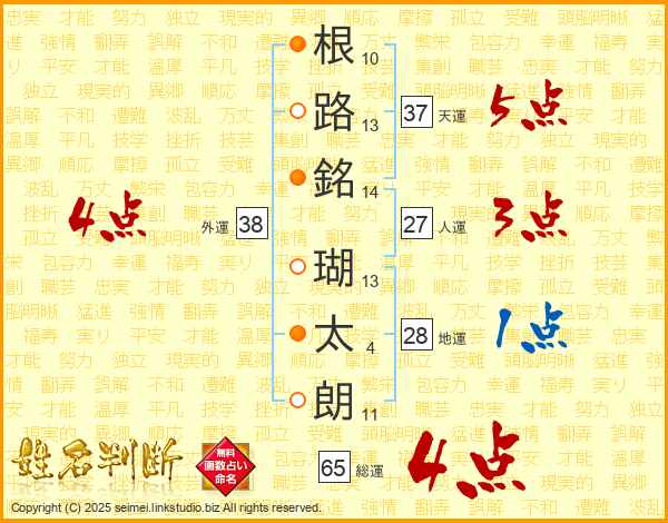 根(10画)路(13画)銘(14画) 瑚(13画)太(4画)朗(11画)