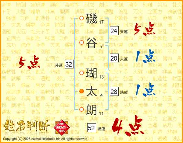 磯(17画)谷(7画) 瑚(13画)太(4画)朗(11画)