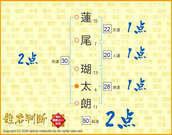 蓮(15画)尾(7画) 瑚(13画)太(4画)朗(11画)