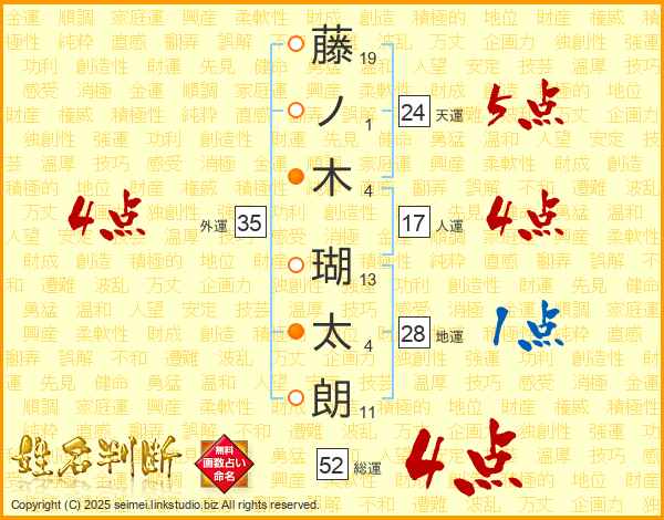 藤(19画)ノ(1画)木(4画) 瑚(13画)太(4画)朗(11画)