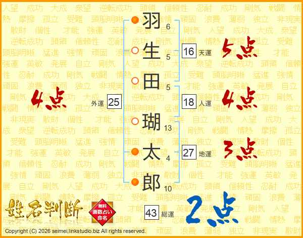 羽(6画)生(5画)田(5画) 瑚(13画)太(4画)郎(10画)