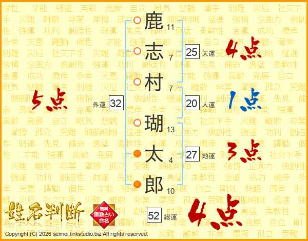 鹿(11画)志(7画)村(7画) 瑚(13画)太(4画)郎(10画)