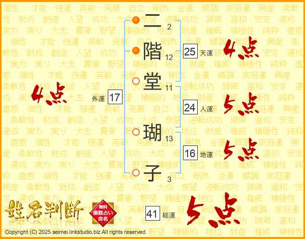 二(2画)階(12画)堂(11画) 瑚(13画)子(3画)