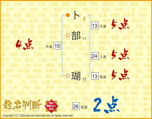 生活面を象徴する運勢です。外部から受ける影響力を表し、結婚運、家庭運や職場、環境への順応性を表します。総運から人運を引いた画数。姓や名が1文字の場合を除く。