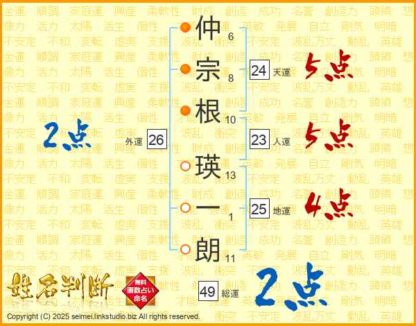 仲(6画)宗(8画)根(10画) 瑛(13画)一(1画)朗(11画)