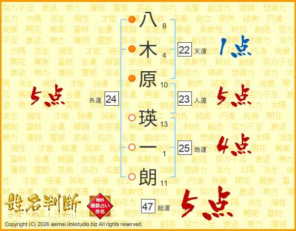 八(8画)木(4画)原(10画) 瑛(13画)一(1画)朗(11画)