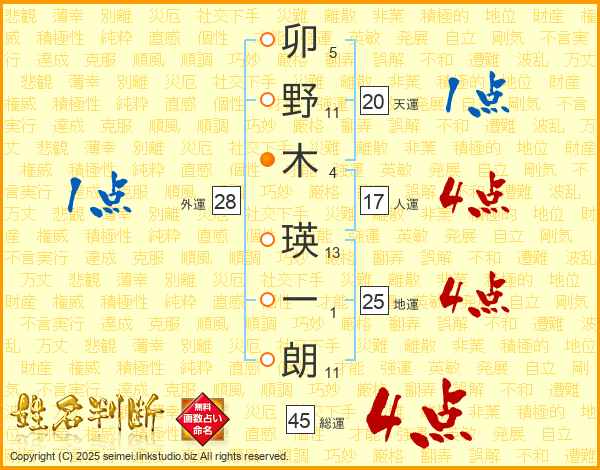卯(5画)野(11画)木(4画) 瑛(13画)一(1画)朗(11画)
