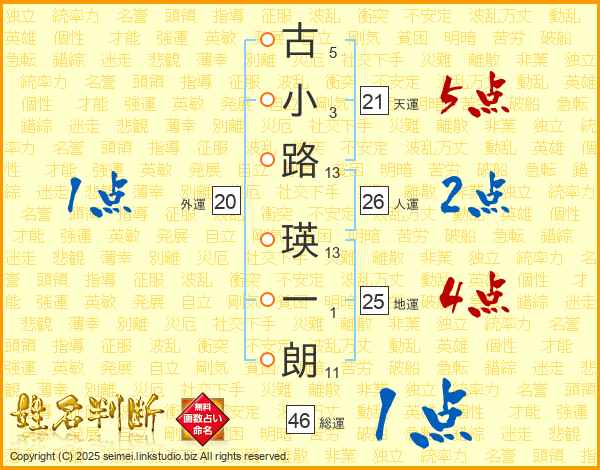 古(5画)小(3画)路(13画) 瑛(13画)一(1画)朗(11画)