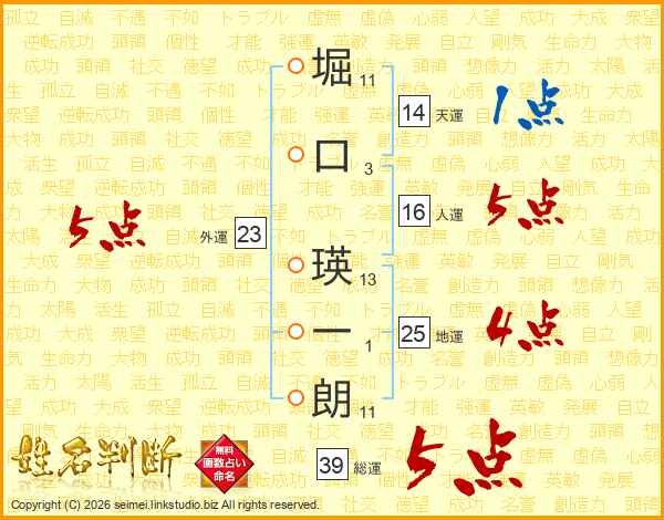 堀(11画)口(3画) 瑛(13画)一(1画)朗(11画)