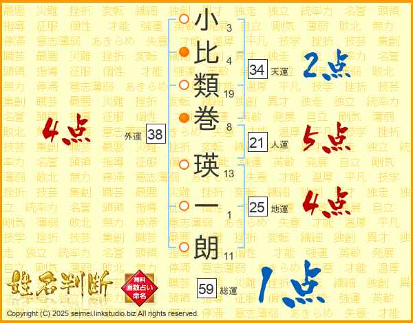 小(3画)比(4画)類(19画)巻(8画) 瑛(13画)一(1画)朗(11画)