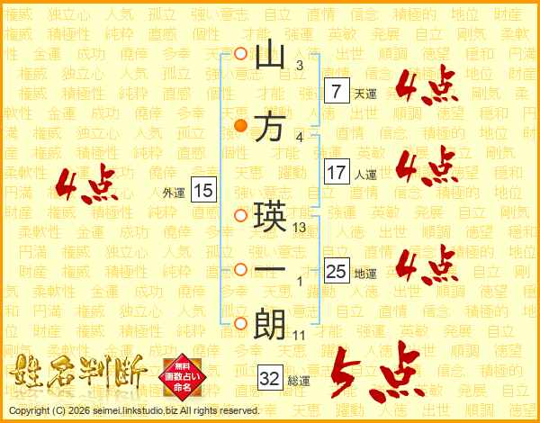 山(3画)方(4画) 瑛(13画)一(1画)朗(11画)