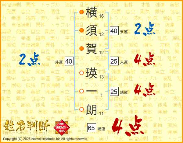 横(16画)須(12画)賀(12画) 瑛(13画)一(1画)朗(11画)