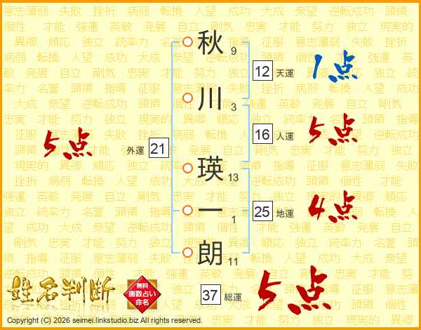秋川瑛一朗さんの総運は37画の5点!