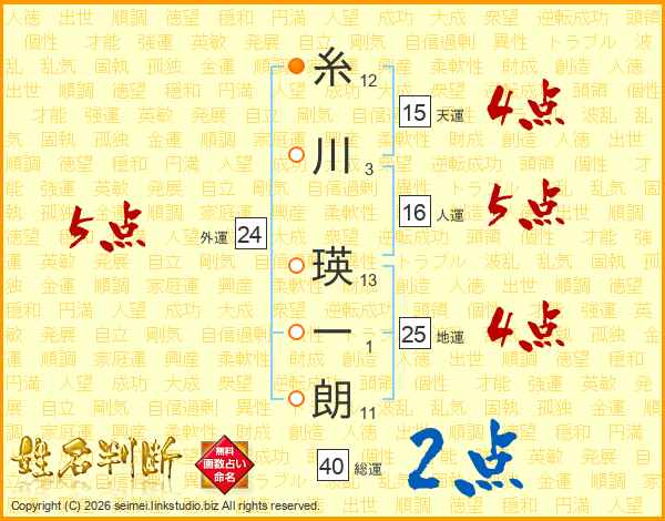 糸川瑛一朗さんの総運は40画の2点!