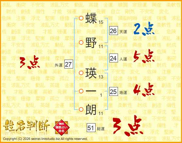 蝶(15画)野(11画) 瑛(13画)一(1画)朗(11画)