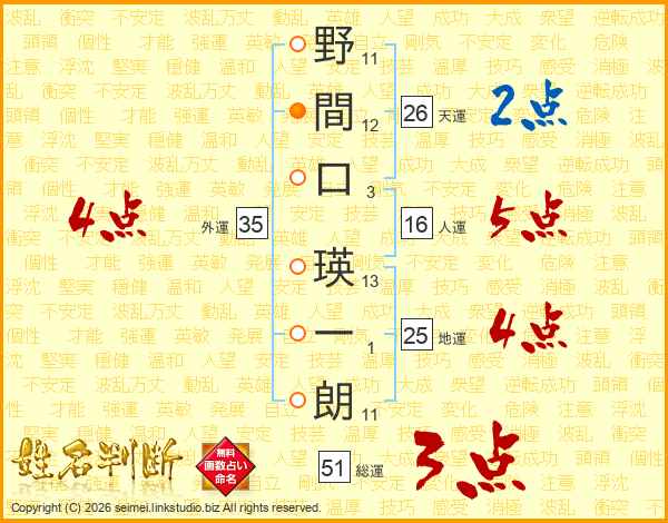 野(11画)間(12画)口(3画) 瑛(13画)一(1画)朗(11画)