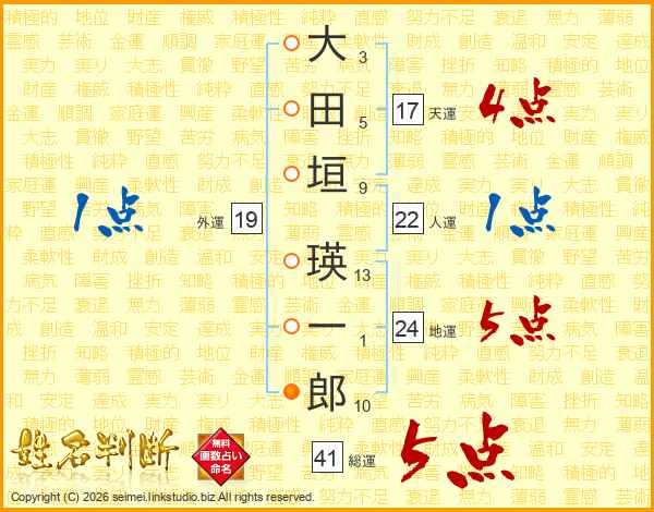 大田垣瑛一郎さんの総運は41画の5点!