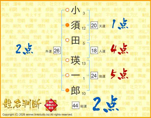 小(3画)須(12画)田(5画) 瑛(13画)一(1画)郎(10画)