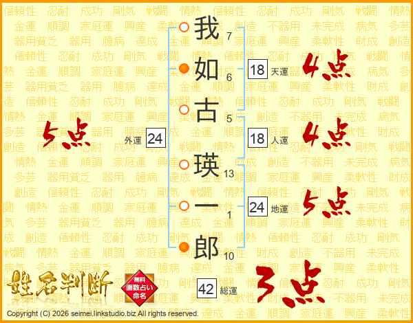 我(7画)如(6画)古(5画) 瑛(13画)一(1画)郎(10画)