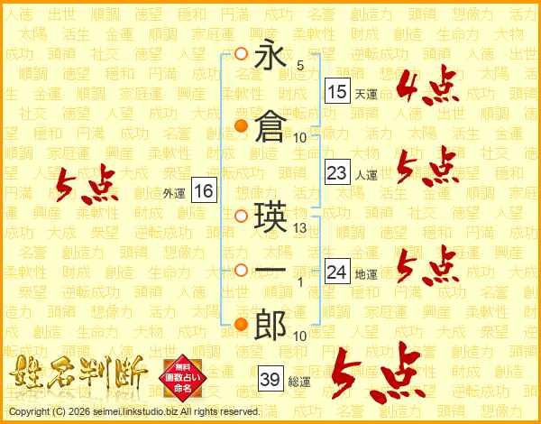 永(5画)倉(10画) 瑛(13画)一(1画)郎(10画)