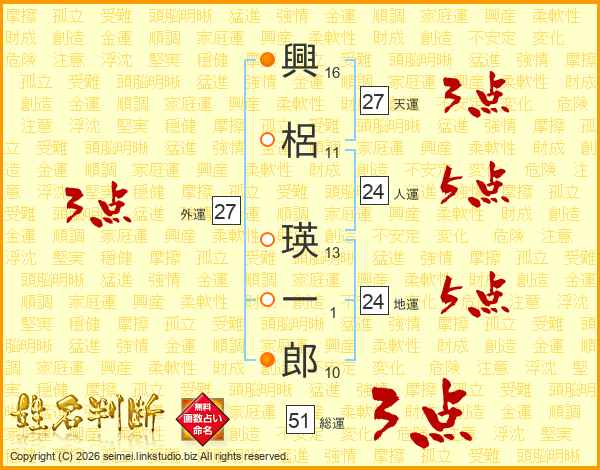 興(16画)梠(11画) 瑛(13画)一(1画)郎(10画)