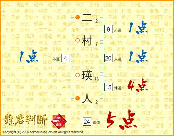 生活面を象徴する運勢です。外部から受ける影響力を表し、結婚運、家庭運や職場、環境への順応性を表します。総運から人運を引いた画数。姓や名が1文字の場合を除く。