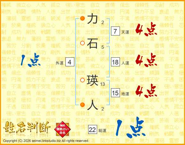 生活面を象徴する運勢です。外部から受ける影響力を表し、結婚運、家庭運や職場、環境への順応性を表します。総運から人運を引いた画数。姓や名が1文字の場合を除く。