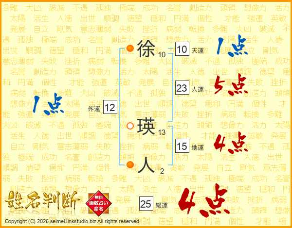 徐(10画) 瑛(13画)人(2画)