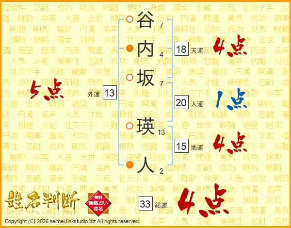 谷内坂瑛人さんの総運は33画の4点!