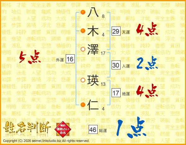 八(8画)木(4画)澤(17画) 瑛(13画)仁(4画)