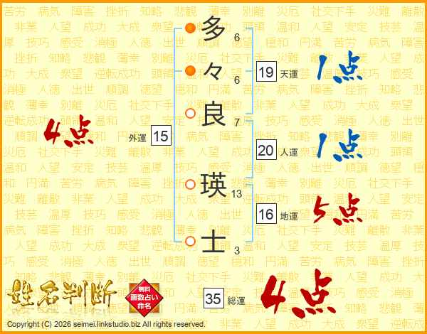 多(6画)々(6画)良(7画) 瑛(13画)士(3画)