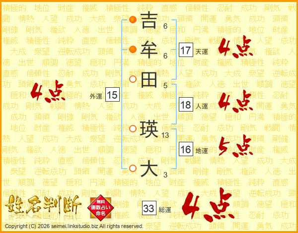 吉(6画)牟(6画)田(5画) 瑛(13画)大(3画)