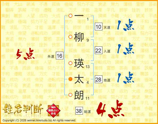 一柳瑛太朗さんの総運は38画の4点!