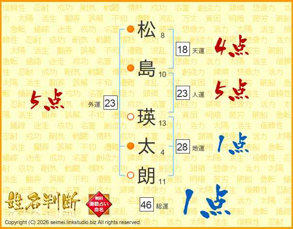 松(8画)島(10画) 瑛(13画)太(4画)朗(11画)