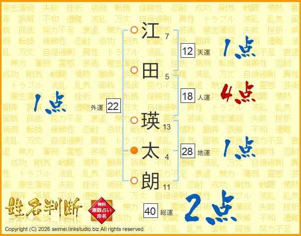 江(7画)田(5画) 瑛(13画)太(4画)朗(11画)