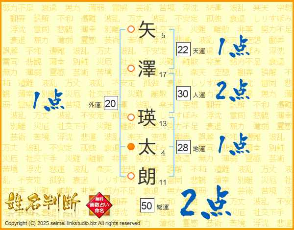矢(5画)澤(17画) 瑛(13画)太(4画)朗(11画)