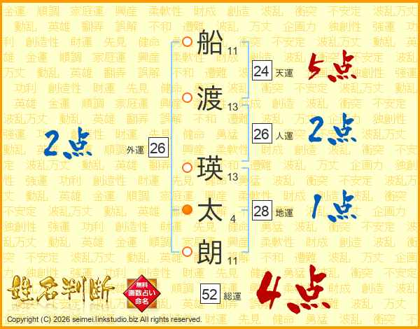 船(11画)渡(13画) 瑛(13画)太(4画)朗(11画)