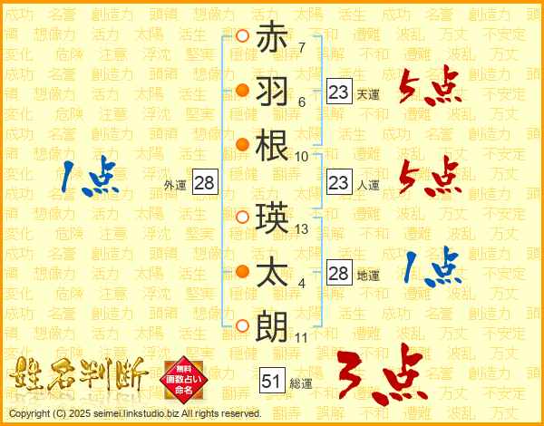 赤(7画)羽(6画)根(10画) 瑛(13画)太(4画)朗(11画)