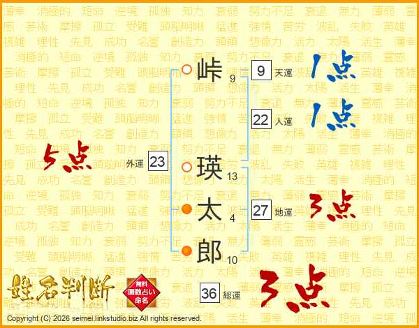 峠(9画) 瑛(13画)太(4画)郎(10画)