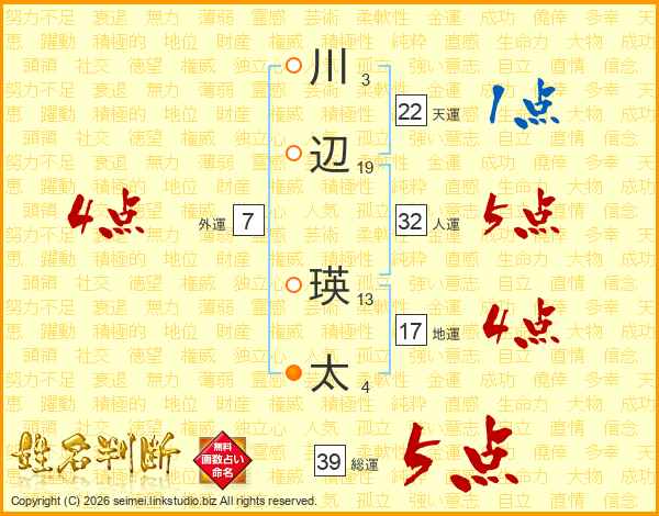 川辺瑛太さんの総運は39画の5点!