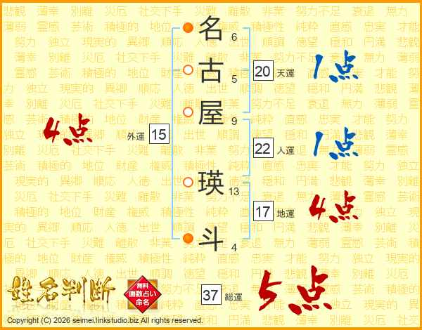 名(6画)古(5画)屋(9画) 瑛(13画)斗(4画)