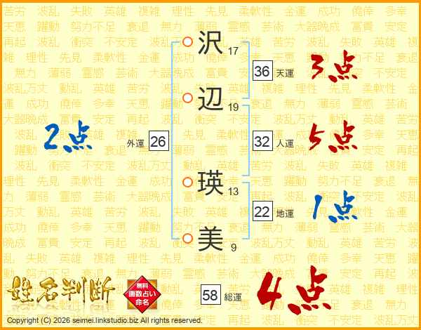 沢(17画)辺(19画) 瑛(13画)美(9画)