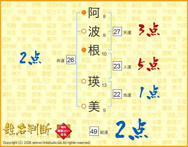 阿(8画)波(9画)根(10画) 瑛(13画)美(9画)